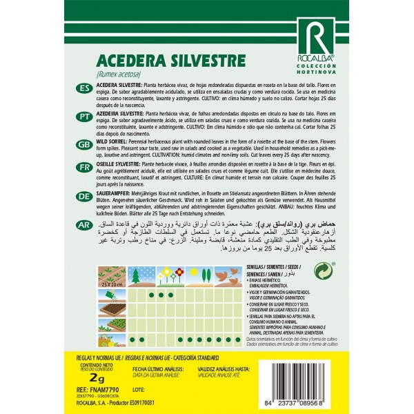 Planta herbácea vivaz, de hojas redondeadas dispuestas en roseta en la base del tallo. Flores en espiga. De sabor agradablemente acidulado, se utiliza en ensaladas crudas y como verdura cocida. Se usa en medicina casera como reconstituyente, laxante y astringente. CULTIVO: en clima húmedo y suelo no calizo. Cortar hojas 25 días después de la nascencia.