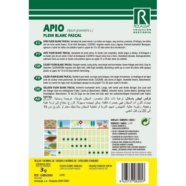 Variedad de porte erecto. Los tallos son largos, muy anchos y macizos. El follaje y los tallos son de color verde franco. Es de fácil blanqueo. CULTIVO: requiere suelos ricos y ligeros. Elevada humedad. Blanqueo: aporcar o cubrir los tallos con plástico opaco o papel de 15 a 20 días antes de la recolección.