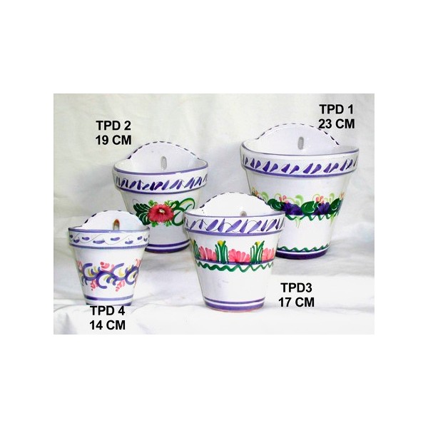 Macetas de barro cocido y liso de decoración al estilo andaluz, pensadas para colgar en cualquier pared, ya que ya llevan un agujero para poderla colgar sin necesidad de soportes. De gran resistencia al frío y al calor es ideal tanto para interior como para exterior. Pintada con pinturas de primera calidad, muy resistentes y de muy larga duración.