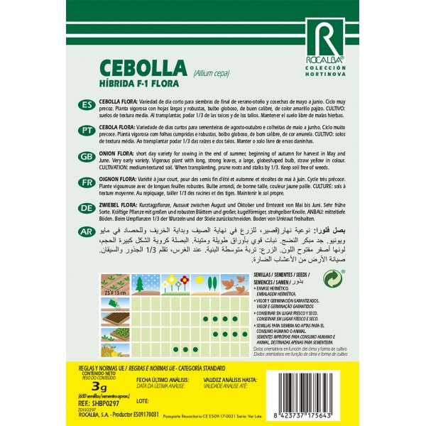 Variedad de día corto para siembras de final de verano-otoño y cosechas de mayo a junio. Ciclo muy precoz. Planta vigorosa con hojas largas y robustas, bulbo globoso, de buen calibre, de color amarillo pajizo. CULTIVO: suelos de textura media. Al transplantar, podar 1/3 de las raíces y de los tallos. Mantener el suelo libre de malas hierbas.