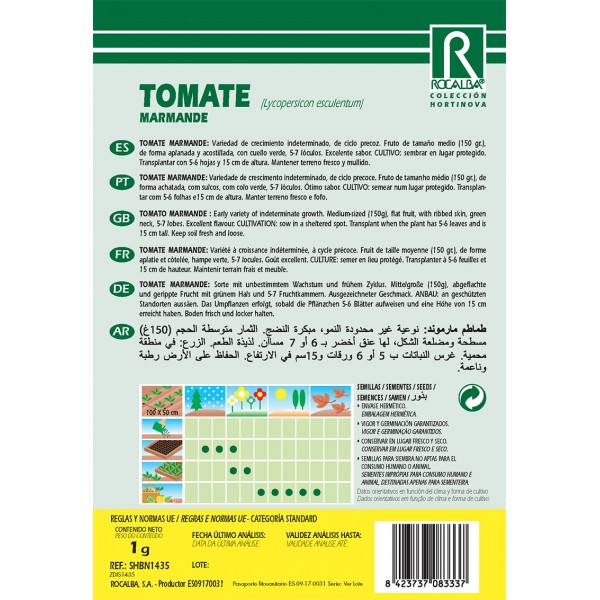 Variedad de crecimiento indeterminado, de ciclo precoz. Fruto de tamaño medio (150 gr.), de forma aplanada y acostillada, con cuello verde, 5-7 lóculos. Excelente sabor. CULTIVO: sembrar en lugar protegido. Transplantar con 5-6 hojas y 15 cm de altura. Mantener terreno fresco y mullido