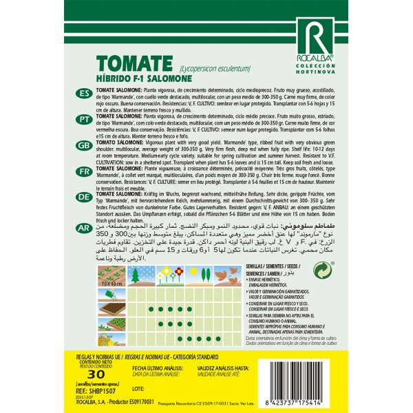 Planta vigorosa, de crecimiento determinado, ciclo medioprecoz. Fruto muy grueso, acostillado, de tipo ‘Marmande’, con cuello verde destacado, multilocular, con un peso medio de 300-350 g. Carne muy firme, de color rojo oscuro. Buena conservación. Resistencias: V, F. CULTIVO: sembrar en lugar protegido. Transplantar con 5-6 hojas y 15 cm de altura. Mantener terreno fresco y mullido.