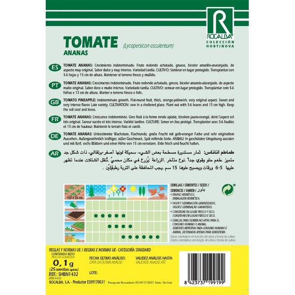 Crecimiento indeterminado. Fruto redondo achatado, grueso, bicolor amarillo-anaranjado, de aspecto muy original. Sabor dulce y muy intenso. Variedad tardía. CULTIVO: Sembrar en lugar protegido. Transplantar con 5-6 hojas y 15 cm de altura. Mantener el terreno fresco y mullido.