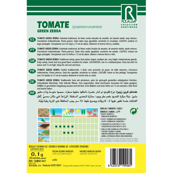 Variedad tradicional, de frutos verde veteados de amarillo, de tamaño medio, muy vistosos. Crecimiento indeterminado. Planta precoz. Sabor dulce muy agradable; excelente en ensaladas. CULTIVO: sembrar en lugar protegido. Transplantar con 5-6 hojas y 15 cm de altura. Mantener el terreno fresco y mullido.