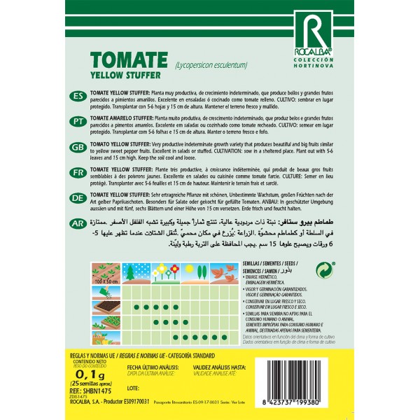 Planta muy productiva, de crecimiento indeterminado, que produce bellos y grandes frutos parecidos a pimientos amarillos. Excelente en ensaladas ó cocinado como tomate relleno. CULTIVO: sembrar en lugar protegido. Transplantar con 5-6 hojas y 15 cm de altura. Mantener el terreno fresco y mullido.