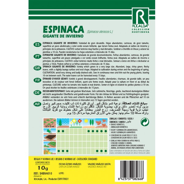 Variedad de gran desarollo. Hojas abundantes, carnosas, de gran tamaño, superficie un poco abollonada y color verde oscuro brillante, que tienen forma oval. Adaptada al cultivo de invierno y principios de la primavera. CULTIVO: evitar terrenos muy fuertes y mal drenados. Sembrar a chorrillo en líneas y aclarar las plantitas a 10 cm. Pueden recolectarse las hojas exteriores a intervalos de 15 días.