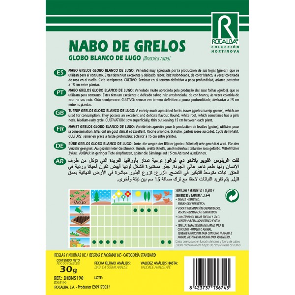 Variedad muy apreciada por la producción de sus hojas (grelos), que se utilizan para el consumo. Estas tienen un excelente y delicado sabor. Raíz redondeada, de color blanco, a veces coloreada de rosa en el cuello. Ciclo semiprecoz. CULTIVO: Sembrar en el terreno definitivo a poca profundidad, aclareo posterior a 15 cm entre plantas