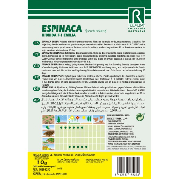 Variedad híbrida de primavera-verano. Planta de desarrollo medio, muy resistente a la subida a flor. Hojas lisas, de color verde oscuro, que destacan por su excelente calidad. Resistencia al Mildiu: razas 1-10. CULTIVO: evitar terrenos muy fuertes y mal drenados. Sembrar a chorrillo en líneas y aclarar las plantitas a 10 cm. Pueden recolectarse las hojas exteriores a intervalos de 10 días.