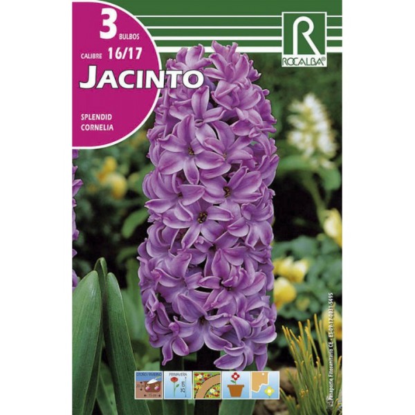 El jacinto es una planta bulbosa perenne de la familia de las liláceas originaria de la región mediterránea, de hojas lineares y carnosas que produce una sola espiga densamente poblada de perfumadas flores de distintos colores, predominando los azules, rosas, blancos y amarillos entre otros, no existen bicolores. Los bulbos se plantan en otoño y florecen en primavera. Prefiere los lugares soleados y hay que regar al principio de la plantación y ligeramente durante el cultivo, manteniendo la humedad y evitando el riego en abundancia y el encharcamiento. Con una altura de entre 20/25 cm el marco de plantación debe ser de 15 cm.