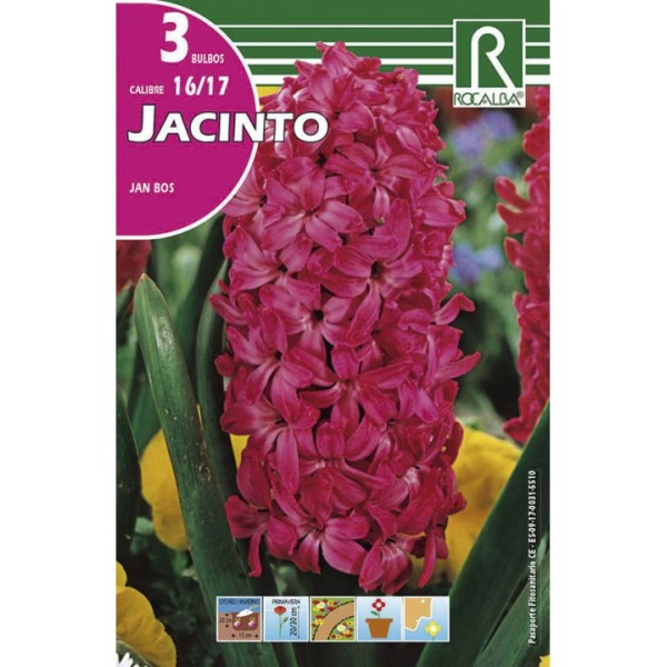 El jacinto es una planta bulbosa perenne de la familia de las liláceas originaria de la región mediterránea, de hojas lineares y carnosas que produce una sola espiga densamente poblada de perfumadas flores de distintos colores, predominando los azules, rosas, blancos y amarillos entre otros, no existen bicolores. Los bulbos se plantan en otoño y florecen en primavera. Prefiere los lugares soleados y hay que regar al principio de la plantación y ligeramente durante el cultivo, manteniendo la humedad y evitando el riego en abundancia y el encharcamiento. Con una altura de entre 20/25 cm el marco de plantación debe ser de 15 cm.