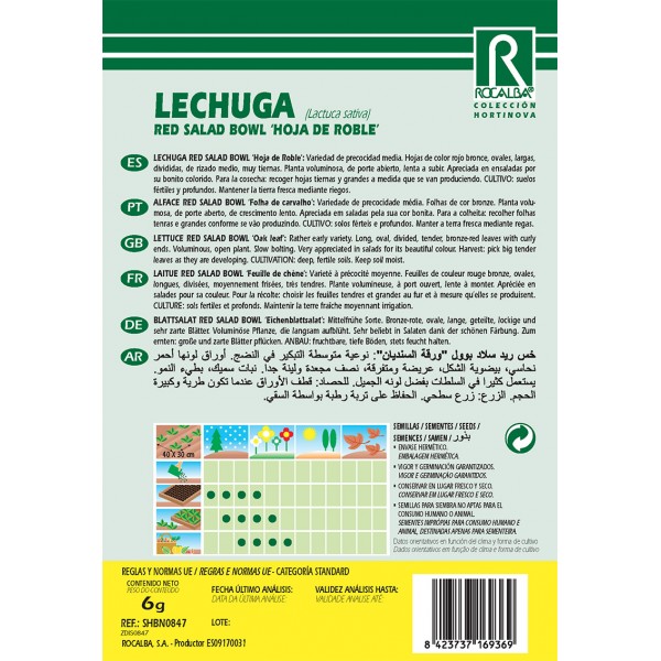 Variedad de precocidad media. Hojas de color rojo bronce, ovales, largas, divididas, de rizado medio, muy tiernas. Planta voluminosa, de porte abierto, lenta a subir. Apreciada en ensaladas por su bonito colorido. Para la cosecha: recoger hojas tiernas y grandes a medida que se van produciendo. CULTIVO: suelos fértiles y profundos. Mantener la tierra fresca mediante riegos.