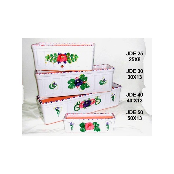 Jardinera rectangular de barro cocido y liso de decoración al estil andaluz. De gran resistencia al frío y al calor es ideal tanto para interior como para exterior. Pintada con pinturas de primera calidad, muy resistentes y de muy larga duración. Ideal para ventanas y salientes por su robustez y aplomo.