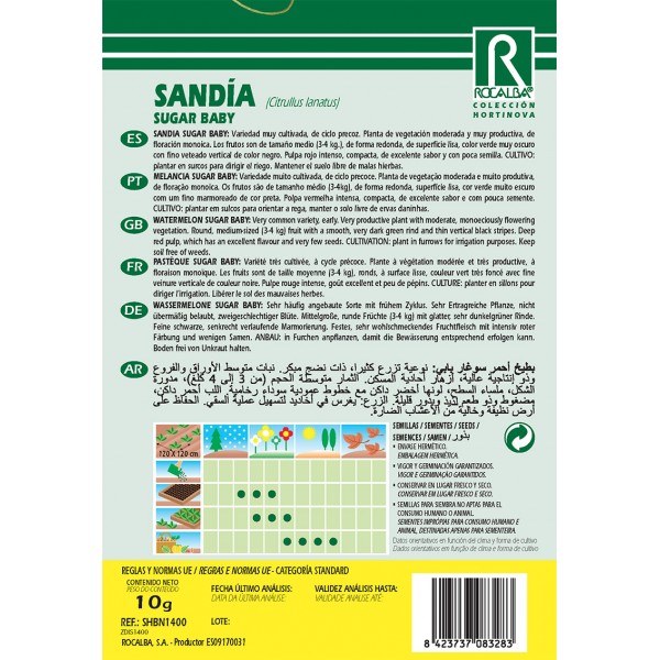Variedad muy cultivada, de ciclo precoz. Planta de vegetación moderada y muy productiva, de floración monoica. Los frutos son de tamaño medio (3-4 kg.), de forma redonda, de superficie lisa, color verde muy oscuro con fino veteado vertical de color negro. Pulpa rojo intenso, compacta, de excelente sabor y con poca semilla. CULTIVO: plantar en surcos para dirigir el riego. Mantener el suelo libre de malas hierbas.